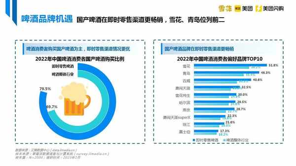 國傢統計局數據顯示,2017年-2022年,中國線上消費品零售市場增長整體較好,隨著新零售模式的盛行,即時零售渠道增長潛力顯現。在啤酒賽道,即時零售渠道增速已遠超其他渠道,有望拉動啤酒市場的整體增長。啤酒以線下渠道消費為主,但隨著即時零售模式的出現,滿足瞭消費者即需即得的飲酒需求。數據顯示,13.7%的啤酒消費者通過即時零售渠道購買啤酒產品,65.4%的消費者通過美團閃購下單啤酒。