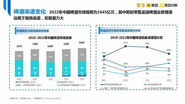 iiMedia Research(艾媒咨詢)數據顯示,2022年中國啤酒市場規模為1645億元,其中即時零售渠道啤酒業務增速遠高於其他渠道。即時零售消費習慣養成帶動即時零售行業規模上升。艾媒咨詢預測,2023年中國即時零售整體行業規模將達7530億元,行業整體具有強勁增長動力和較大發展空間。隨著消費者線上購物習慣的養成,即時零售渠道啤酒配送方便快捷、即時飲用的特性得到市場驗證,預計未來三年(2023-2025)中國即時零售啤酒市場將保持30%以上的增速,成為拉動啤酒市場上升的新增量。