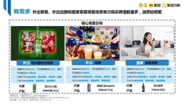 即時零售消費者年輕男性居多,他們有長年的飲酒習慣且消費基礎較好,主要因為方便快捷、習慣延展選擇即時零售渠道購買啤酒。消費者對即時零售啤酒的需求逐漸顯現,消費者粘性較高。啤酒飲用場景逐漸多元化,有38.4%的消費者在即時零售渠道購酒金額超過2021年,並拉動瞭即時零售渠道“下酒菜”的銷量。