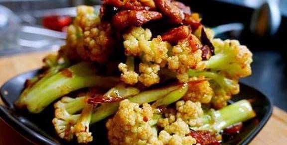 有機花菜半顆;五花肉少許;幹辣椒少許;蒜籽五顆;糖少許;生抽少許