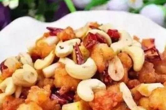 2、凈鍋裡放油燒至四成熱時,下雞肉丁滑油並倒出來瀝油。鍋留底油,下幹辣椒節、花椒和蔥彈子炒香,在倒入雞肉丁烹入用鹽、糖、香醋、鮮檸檬汁和濕生粉調勻的酸甜味汁,炒勻勾芡後起鍋加入烘烤後的腰果,盛入盤內成菜。