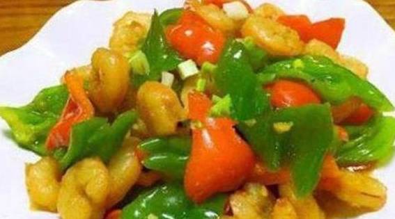 2、大火放入青紅椒略炒後加鹽,之後加入蝦仁翻炒幾分鐘,出鍋瞭。