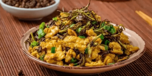 第一步,香椿放入熱水中焯至變色;第二步,放涼後切成碎末備用;第三步,香椿碎加雞蛋、鹽攪拌均勻;第四步,導入熱油中,翻炒至雞蛋定型上色即可出鍋。