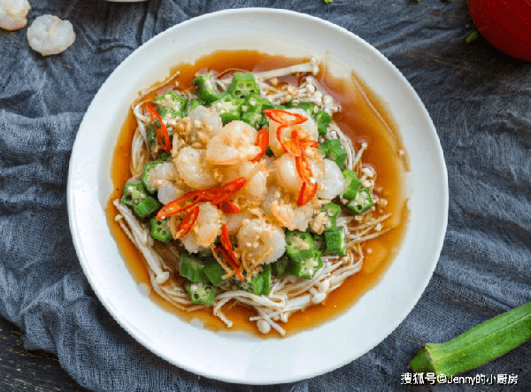 盤內放入金針菇、秋葵、蝦仁、小米椒,按順序放好,再倒入料汁,這道菜就做好瞭。