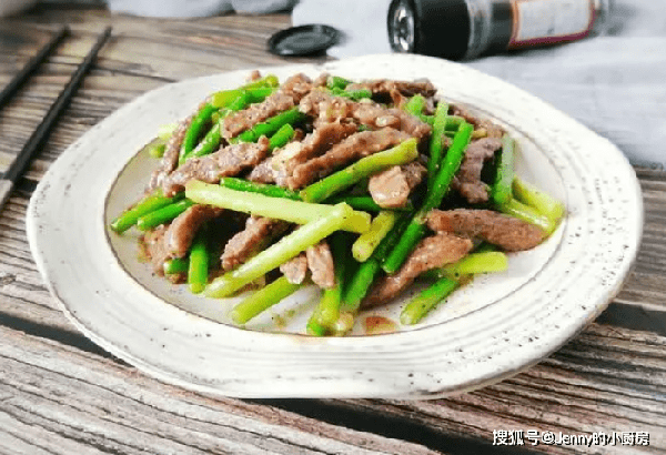 接著倒入生抽、蠔油翻炒均勻,再倒入牛肉快速翻炒幾下,這道菜就做好瞭。