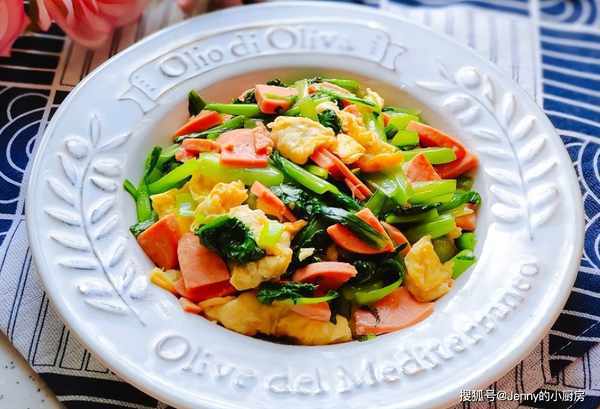重新加油,燒熱後倒入蒜末、火腿腸或者胡蘿卜翻炒,炒一分鐘,再倒入青菜翻炒。