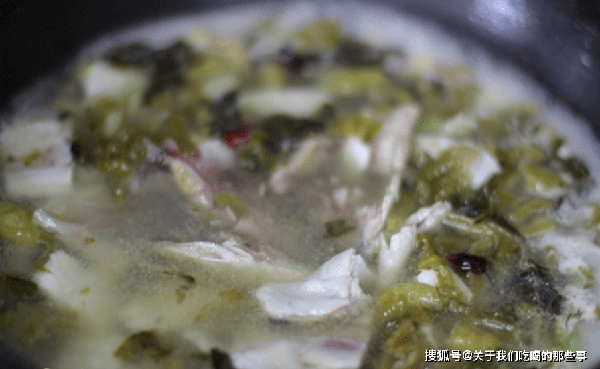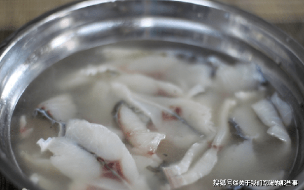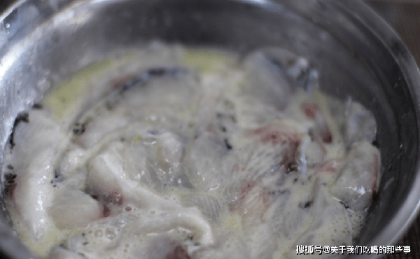 5、撈出魚頭、魚骨、酸菜,放入菜盆中。鍋裡的魚湯燒開,放入醃好的魚片,要一片一片地下鍋,煮至魚片變白後即可撈出,再煮就老瞭。