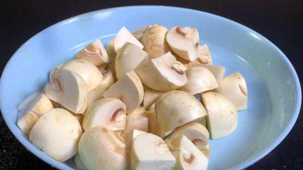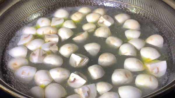 3.鍋內倒入適量的水,水開後,加入一小勺食鹽、幾滴食用油,倒入口蘑,用勺子輕輕推動,使其受熱均勻,將蘑菇焯水,可以有效的去除草酸,焯水兩分鐘左右,撈出控水備用。
