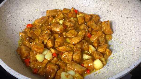 4.鍋內加入少許食用油,油熱後,倒入薑蒜、小米椒,炒出香味後,雞胸肉,大火開始翻炒,大概翻炒兩分鐘左右,倒入口蘑,繼續大火翻炒。