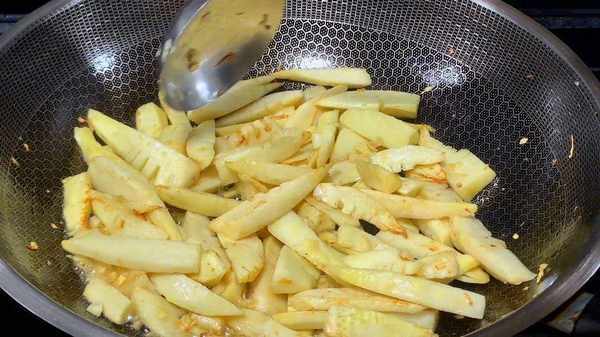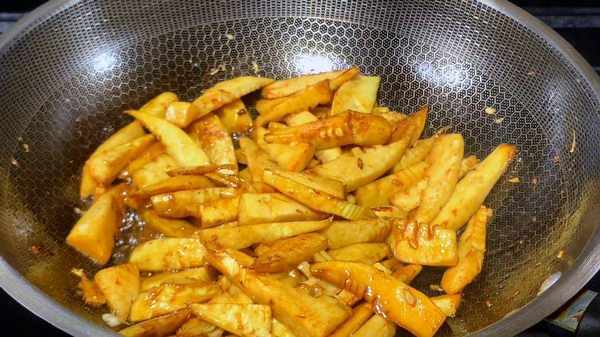 2.鍋內加入一塊豬油,油熱後,倒入春筍,中小火快速翻炒,大概翻炒4分鐘左右,加入少許米酒、半勺生抽、少許老抽、一點白糖,繼續中小火翻炒,炒出醬香味,蓋上鍋蓋,轉小火給它燜3分鐘。