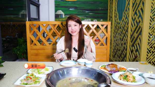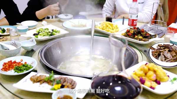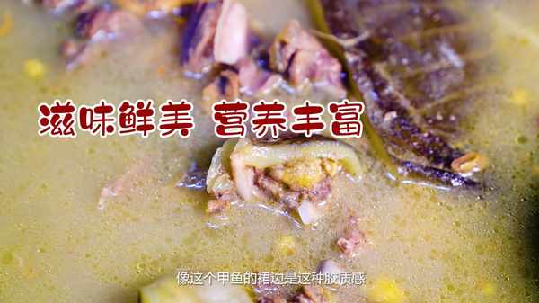 主持人:剛剛這火焰甲魚真的是很有儀式感啊,像什麼腰子啊,鴿子啊,鱔魚啊都可以往裡面加,吃完這一頓,絕對大補。這個甲魚肉是非常有嚼勁的,像這個甲魚的裙邊是這種膠質感,QQ彈彈的很好吃,點贊!