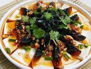 材料:豆腐、皮蛋、紅辣椒、蔥花、辣椒油、蔥、 糖、醬油、薑蒜、鹽、香菜、香醋