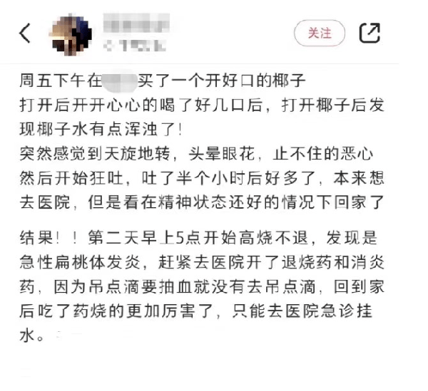 完好的椰子水裡面沒有塊狀物,如果出現塊狀物且有明顯的沉淀,這樣的椰子水就已經變質瞭。