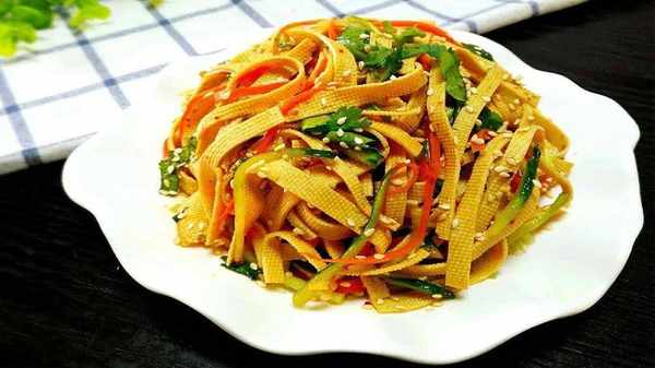 豆腐皮、紫甘蘭三片、紅柿椒半個、鹽半勺、味精適量、香醋兩勺、宴友香油適量