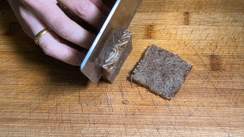 1. 將買回來的皮渣放到案板上,用刀切成薄片,大概在5毫米左右