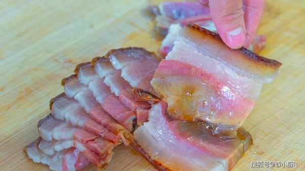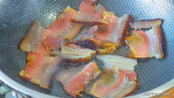 8、先炒臘肉可以把臘肉炒香,同時也能把臘肉裡面的油脂煸炒出來,吃起來不膩,臘肉炒好先盛出來。