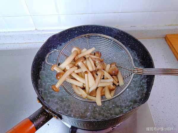 4、接著把蟹味菇也焯一下水,鍋裡的水開後倒入蟹味菇,焯水兩分鐘後也撈出來瀝幹水分。