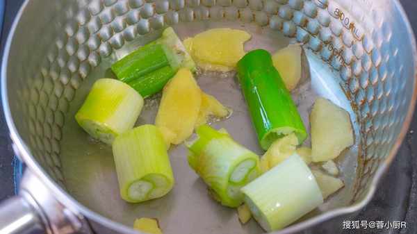 4、接著我們再來切點蔥薑,大蔥切小段,生薑切片。切好後起鍋熱油,一點點油就夠瞭,接著倒入大蔥和生薑,稍微的炒一炒,炒一分鐘後先盛出來。