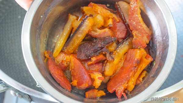 3、接著準備一塊臘肉,這是我們自己傢的臘肉,清洗幹凈後放入鍋裡煮一下,先把臘肉煮熟,吃起來口感會更好。