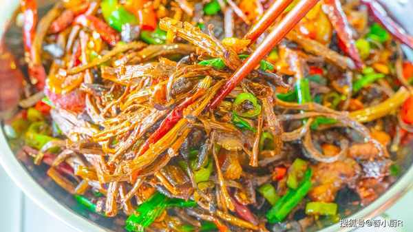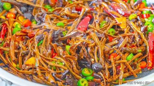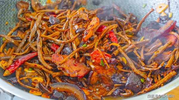 食材清單:幹茶樹菇100克、臘肉一塊、青紅辣椒各3個、蒜苗1把、洋蔥1個、蔥、薑、蒜、幹辣椒
