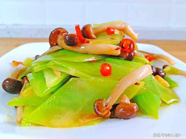 5、起鍋熱油,下蔥蒜小米椒爆香,接著把萵筍和蟹味菇倒進來,大火翻炒半分鐘。調味加鹽、雞精、少許的蠔油,翻炒均勻後就可以關火出鍋瞭,好吃的萵筍炒菌菇就做好瞭。