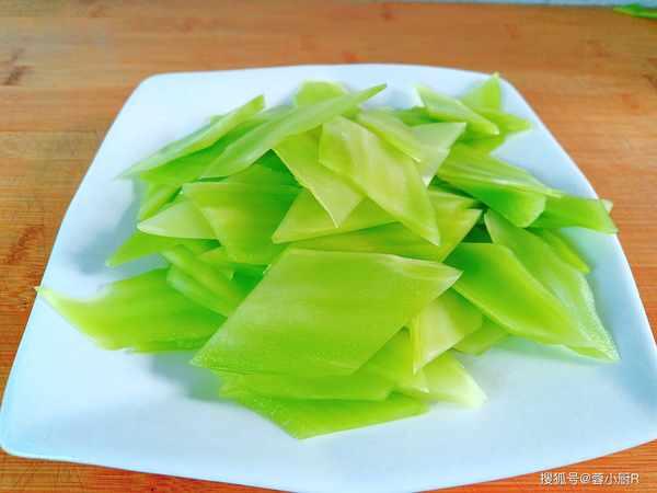 1、萵筍買回來後先把葉子摘掉,接著就可以開始削皮瞭。萵筍削好後先斜著段成小段兒,再切成菱形片。切好後裝入碗裡,加清水泡著,避免氧化變黑,如果馬上下鍋烹飪的話就不用。