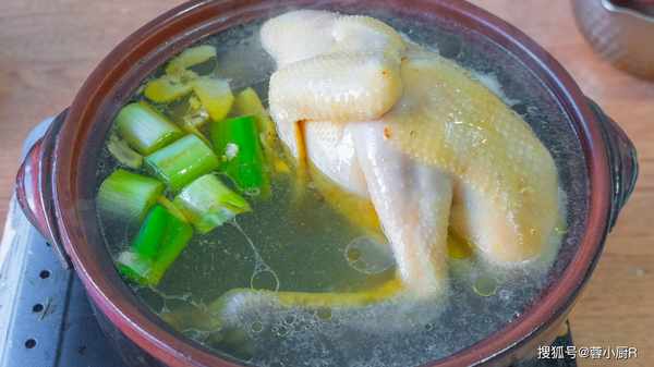 5、接著起鍋燒水,水開放入三黃雞,整隻都放進去,然後加炒好的蔥薑,再來一勺料酒去腥。開中火繼續煮,煮開後撇去浮沫,然後蓋上蓋子轉小火繼續煮一個小時。