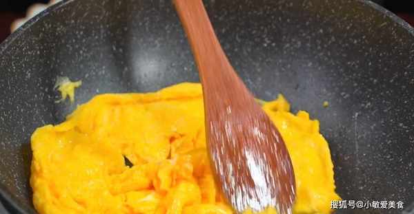 5、起鍋倒入菜籽油,油熱後倒入雞蛋液,小火煎至定型,再翻一面,這樣炒出來的雞蛋會更嫩一些,盛出備用。