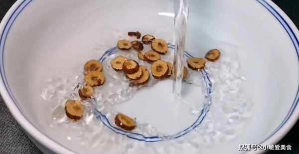 2、準備一小把紅棗片,放到一個大碗中,再倒適量的清水,抓洗幹凈,先放到邊上備用。