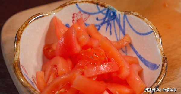 2、準備一個西紅柿,打上花刀,倒入開水燙上一分鐘左右,這樣更方便去皮。去皮再全部切成小塊,裝入碗中備用。