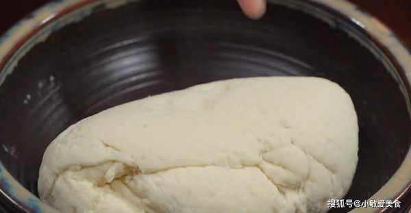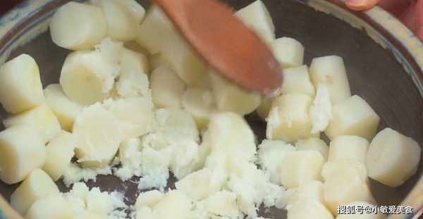 4、山藥已經蒸好瞭,壓成細膩的山藥泥,加入適量面粉。少量多次的加入純牛奶,攪拌成這樣的面絮狀。揉成一個稍微偏軟一點的面團。