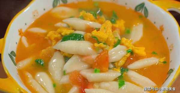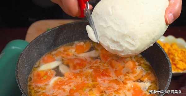 6、鍋留底油,下入蔥白,小火炒出香味,再放入切好的西紅柿,中火翻炒,炒出西紅柿的汁水,再加入一大碗清水。水開後用剪刀把面團一片片的剪下來,剪成這樣的面魚狀,全部剪好後開大火,水開後再煮分鐘。