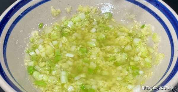 5、蒸雞的時間準備適量的小蔥白,切成蔥花,再準備一小塊的生薑,用刀背拍成薑泥,這樣更容易出味,拍好後再用刀剁細一點。蔥薑切好後裝入小碗中。