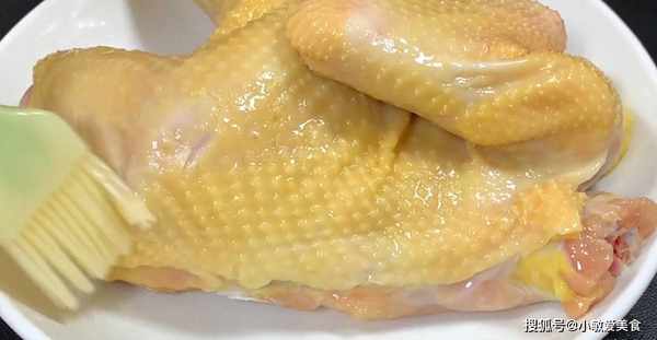 3、雞肉醃制好瞭以後,把裡面的蔥薑撿出來,把雞肉放到一個盤子裡面,然後用小刷子往雞皮上面。刷上一層花生油,這樣可以防止雞肉裡面的水分流失,而且還可以增加香味和雞皮的光澤感。