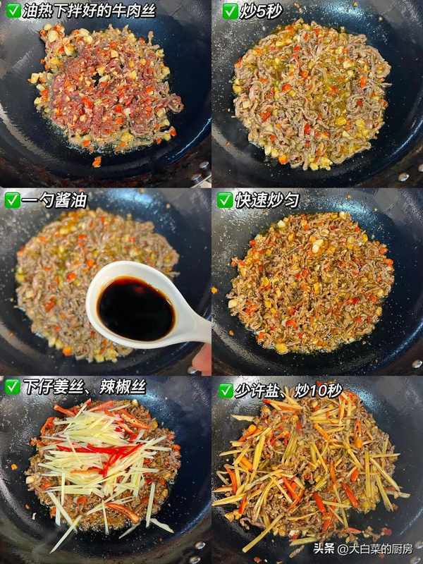 1:起鍋燒油,油要稍微多一點,油溫7成熱的時候下醃好拌勻的牛肉絲