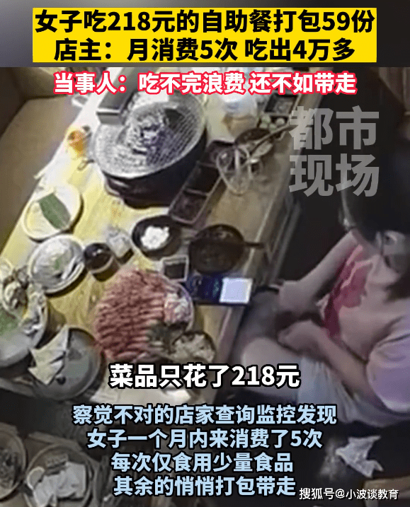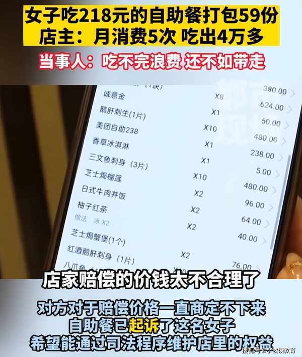 貴州一名女子,吃218元的自助餐,私下裡打包59份帶走,一個月來瞭5次,算下來吃出瞭4萬多元的菜品。如今商傢選擇起訴,維護店裡的權益,而女子卻稱價格不合理。