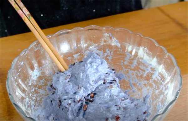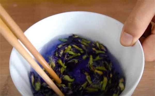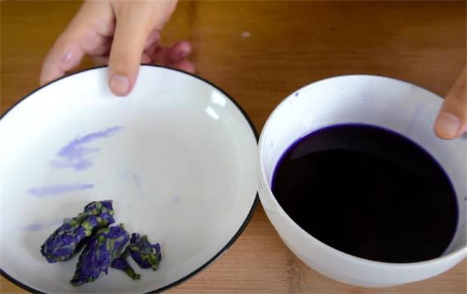 2.大概等瞭20分鐘這個水已經變成微涼瞭,咱們擠一擠,把這個水分擠出來,感覺就像泡瞭一碗藍墨水似的,這些幹瞭的蝶豆花就已經沒用瞭,咱們直接用這個汁水去和面。
