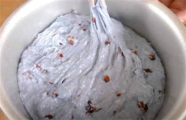 3.現在和面,這是240g的面粉,放上3g的酵母粉,50g白糖,這是用高壓鍋煮的紅豆,咱們放上一些,最後用泡好的這個汁水和面,看看這個顏色就起來瞭,攪成這樣特別粘稠的糊狀。