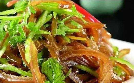 (2)將蛋皮、肉皮和雞脯肉均切成細絲,裝盤後撒入蔥絲,澆入用精鹽、芥末、醋和香油調成的味汁,拌勻即成。