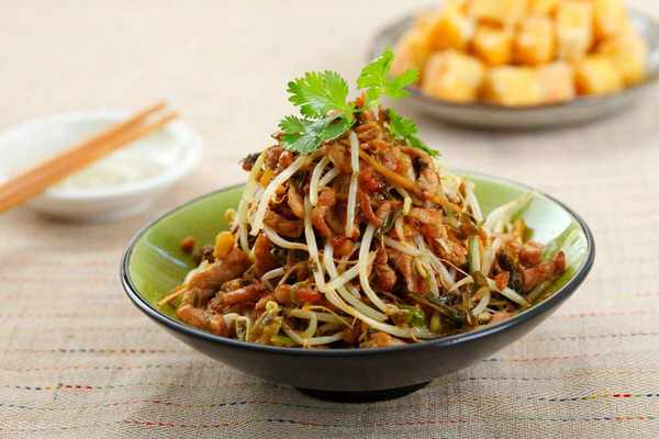 (3)將綠豆芽、肉絲和泡辣椒絲一起放人盤內,加入精鹽、味精、白糖和香油拌勻即成。