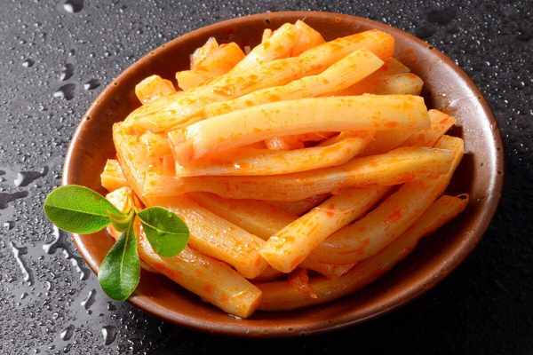 特點:質地脆美,香辣適口,紅中透白。
