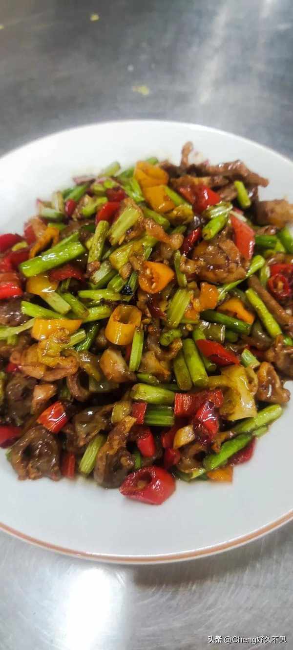 配料:蒜薹,杭椒丁,芹菜段,