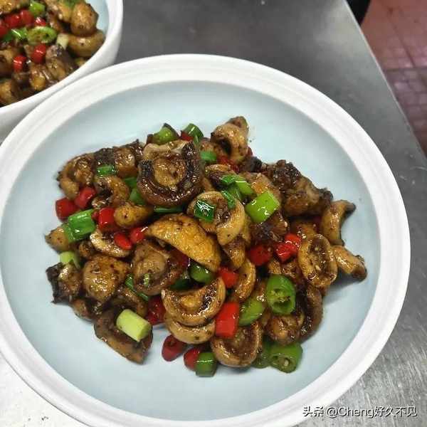 2,鍋留底油下入肉末炒香下入蒜片小米辣薑立青紅杭椒偏炒加耗油生抽黑胡椒汁下入口蘑調雞精味精糖胡椒粉黑胡椒碎辣鮮露撒蒜苗葉翻鍋裝盤