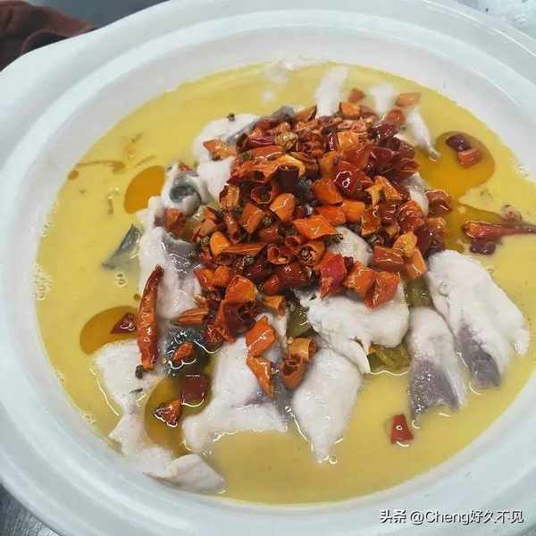 2,鍋留底油下入魚骨魚頭加薑片扁黃加酸菜泡椒花椒幾粒扁加7勺水調菜籽油鹽糖味精胡椒粉胡椒粉白醋雞汁大火燒白撈出底料下入魚片燒熟,倒入盤中