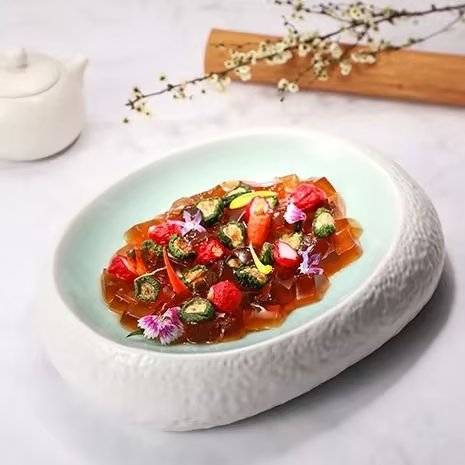 4. 盤中放入啫喱,再放上泡蘿卜、黃瓜,裝飾花草即可。