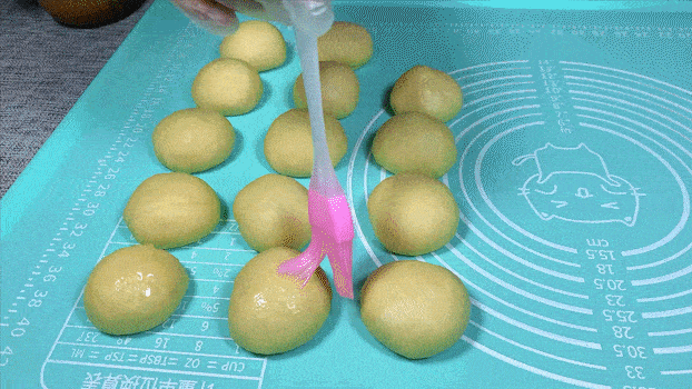 9.團成圓型的面團擺放整齊,然後用刷子在面劑上刷上一層食用油,個個都刷均勻,蓋上保鮮膜再次醒發30分鐘