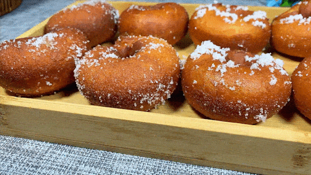14.趁熱乎再放進提前準備好的白糖裡面,讓甜甜圈表皮裹上一層白糖,我們的甜甜圈就做好瞭