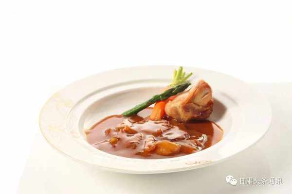 ③蘆筍清洗幹凈,頭部切6厘米長段沸水沖涼備用;手指胡蘿卜清洗幹凈去頭部葉子削皮備用;大蔥300克切2厘米段入500克色拉油中小火炸制金黃色撈出留油;將牛膝骨肉片擺在位碟中成花狀,旁邊擺放蘆筍和手指蘿卜;鍋中加入二湯100克,入李錦記鮑魚汁100克、雞汁30克、冰糖老抽調色,勾薄芡淋入提前炸好的蔥油,汁子均勻淋在擺好的牛膝骨肉上。