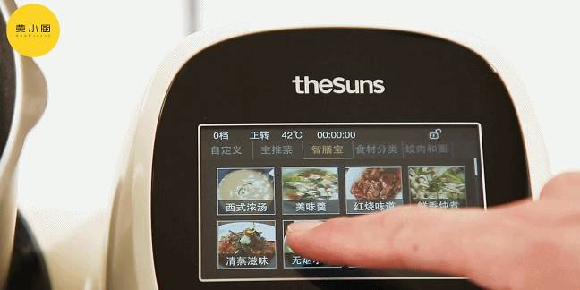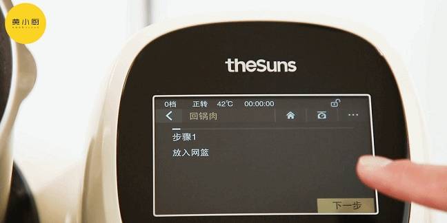 烹飪機選擇無煙小炒,回鍋肉菜譜,點擊開始;烹飪機中放入網籃,下入五花肉,按機器顯示操作即可
