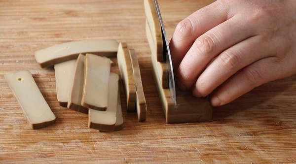 1、 將雞蛋幹切成小條狀,雞蛋幹是熟的直接切好就可以;